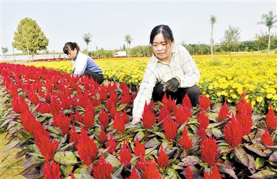 9月22日,王素霞(右)在花卉基地打理盆栽花卉。