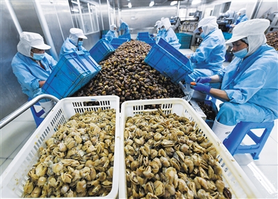 9月22日,工人在嘉兴市潜福食品有限公司的流水线上加工当天从养殖户手中收购的白玉蜗牛。