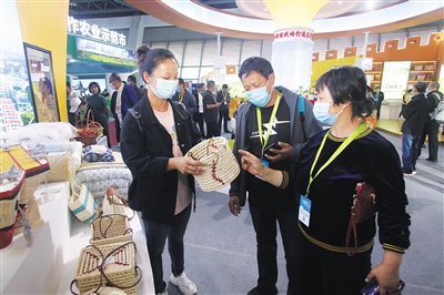 9月23日,2021年中国农民丰收节山西庆祝活动暨第七届中国(山西)特色农产品交易博览会在山西农产品国际交易中心开幕,大同市展区有69家企业共带来300多种特色农产品参展,丰富的绿色农产品吸引了众多观展者前来咨询和了解。图为工作人向观展者介绍玉米皮制作的编织品。