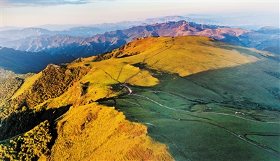 9月23日,一缕阳光照耀在空中草原的山梁上(无人机照片)。