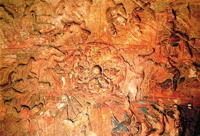 再看第38窟窟顶,满饰平棊藻井,顶部以大朵团莲延展开天宫苍穹,化生童子分别从八个莲叶中飞出,四身骑龙诸天仆乘围绕,四周平棊格内雕刻出二十身飞天乐伎,演奏的乐器为曲颈琵琶、排箫、筚篥、钹、胡笳、五弦琵琶、笙、筝、箜篌、羯鼓、担鼓、琴、细腰鼓、横笛等14种,俨然是生动的音乐盛会。北壁主像为圆拱二佛并坐龛,龛楣内雕坐佛,上沿雕飞天与缨络,窟楣两隅侧面雕供养群像;东壁中央刻两层龛像,上为盝形“地神托双脚”交脚菩萨龛,下为尖拱坐佛龛;西壁盝形帷幕倚坐佛龛。除龛像外,各壁面在主要佛龛周围,雕刻了十一幅佛教故事画面:⒈“乘象投胎”(北壁下层东侧);⒉“逾城出家”(北壁下层西侧);⒊“佛入涅槃”(北壁佛龛东侧);⒋“罗睺罗因缘”(北壁佛龛西侧、东壁南侧上层);⒌“善慧童子以发布地,定光佛授记”(东壁南侧二层);⒍“降伏火龙”(南壁窟门东侧上层);⒎“化现三道宝阶”(南壁窟门东侧中层);⒏“雕鹫怖阿难入定”(南壁窟门东侧下层);⒐“降魔成道”(南壁西侧上层);⒑“初转法轮”(南壁西侧中层);⒒“弥勒菩萨兜率天宫说法”(南壁西侧下层)。