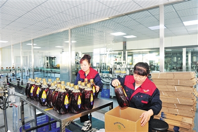 华建油脂有限责任公司通过与农户合作,安排专家通过手把手教导农民种植优质亚麻籽,带动周边近500户农民种植20万亩亚麻,户均可增收近3万元,并为周边5000多户养殖户提供优质饲料,真正实现了农民稳就业、增收入。图为在华建油脂有限责任公司生产车间内,工人正在打包产品。