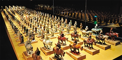 在中国古代,厚葬之风盛行。商周时期用活人来殉葬,春秋战国时期开始使用模拟活人的俑来代替。秦汉时期俑的形体硕大,制作精细,多反映的是一些军队出行时的壮观场面,就像秦始皇兵马俑。目前国内发现的兵马俑阵是汉族俑阵居多,因此北魏的这支地下俑阵更显得独一无二。整个俑阵大部分采用釉陶材质。釉陶这种低温陶器,相较于西安兵马俑涂的生漆来说,更不易掉色,保存长久。