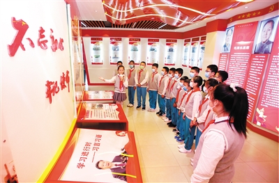 10月12日,在平城区14校的“党史红色展馆”内,少先队员们正在共同学习百年党史。该校将党史学习教育融入日常教学中,每周利用少先队队会时间,以小讲解员讲述革命故事的形式,让学生们了解党的历史和革命先辈的事迹,激发学生们的爱党爱国情怀。图为该校小讲解员正在给少先队员们讲述革命故事。 本报记者 韩堃摄