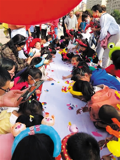 在活动现场,新河湾的小业主们和爸爸妈妈齐聚小区广场,用手中的彩笔绘出精美长卷,献给伟大的祖国,表达心中的爱国之情。