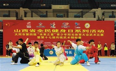本报讯 (记者 史涌涛) 10月17日,在市体育中心体育馆,一个个参赛选手精神抖擞、意气风发,将刀、枪、剑、戟等十八般武艺演绎得虎虎生风,大同市第四届“未来之星”青少年阳光体育大会武术比赛暨第17届传统武术锦标赛在此开赛。