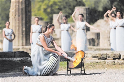 当日,北京冬奥会火种在奥林匹克运动的发祥地——希腊伯罗奔尼撒半岛的古奥林匹亚采集成功。在有着两千多年历史的赫拉神庙遗址前,奥运火种再次为北京点燃。