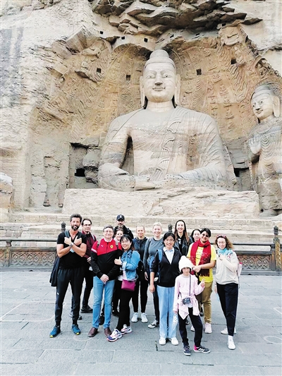 “大同这座城市真是太美了!大同导游就是棒,几天的相处,我从大同导游身上感受到了这座城市的壮美,感受到了云冈石窟的伟大,感受到了悬空寺的奇绝。”近日,常年在北京居住的来自毛里求斯的一名游客游览云冈石窟之后发出感言。这名游客称赞的导游名叫冷栗玮,我市一名英语高级导游。她于几个月前精心筹划,深研大同文旅内涵,为常年在北京工作、生活的各国大使馆工作人员设计了一款“游大同”旅游产品。