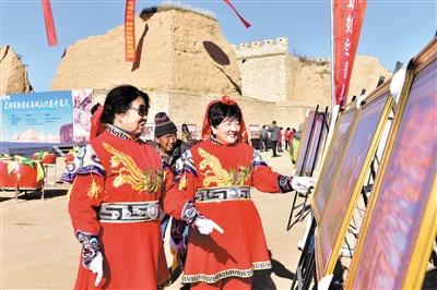 10月19日,新荣区长城文化展在得胜堡开幕。这次展览包括长城婚庆摄影展、长城风光摄影展、万里茶道展、游牧和农耕文化展四个板块,以反映新荣雄伟的长城和多彩的民俗。图为观展群众在观看长城婚庆摄影展。
