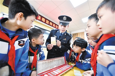 10月27日,在广西融安县第二实验小学,民警向学生们讲解禁毒知识。