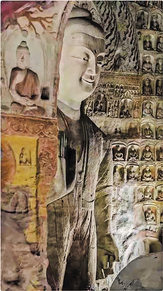 依山凿洞窟,傍水修禅路。阁楼嵌北崖,佛像金身塑。入室凝眸前后睹,震撼浑无措。释迦高入云,仰望虔心悟。三世圣尊皆圣主。抬头望星布龛庐,明窗下维摩会文殊;左右观满壁浮图,拱门上二佛诵毗卢。雕技绝飞天飘带舞,刻法妙宝匣慈面舒。看不够丰富多彩石上书,活脱脱把那佛国故事全盘录。嘘,时光轮转文明固。