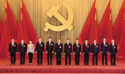 陈安丽(左三)、李凤岐(右三)、吴伟(左二)、卢东亮(右二)、韦韬(左一)、郑连生(右一)当选为省委常委。 山西日报记者 李联军摄