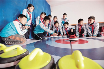 10月29日,遵化市第三实验小学的学生在练习投掷陆地冰壶。