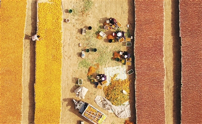 10月30日,万荣县史家埝村农民在加工晾晒柿饼(无人机照片)。