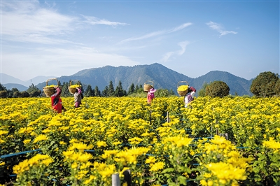 10月31日,在浙江省杭州市淳安县大墅镇桃林村金丝皇菊种植基地,农民在收获金丝皇菊。