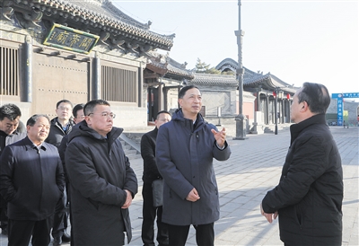 初冬的大同古城,风清气朗,部分历史文化街区和民居院落保护和修复工程仍在加紧推进。在鼓楼东街、鼓楼西街,卢东亮一行沿着广府角、蔡家巷、欢乐街等街巷,一路走、一路听、一路看,了解古城总体规划和名城整改工作中存在哪些困难和问题,查看古城东南片区、东北片区和西南片区历史街区、传统民居、历史遗存保护修复情况,听取各历史街区功能织补和业态规划思路的汇报,与相关部门负责同志共同研究探讨工作推进举措。