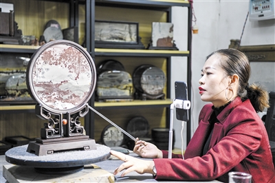 11月25日,在广西武宣县二塘镇一家国画石制品销售门店,工作人员通过直播展示国画石工艺品。