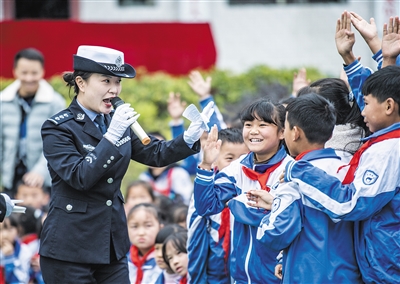 当日是“全国交通安全日”,贵州六盘水市公安交通管理局高速大队走进校园开展丰富有趣的安全教育活动,帮助学生们增强交通安全意识,培养安全出行、文明出行的良好习惯。 新华社记者 陶亮摄