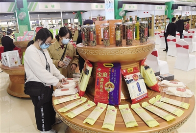 12月10日,在广西扶贫产品展销中心,消费者在参观选购“桂姐姐”线下展销商品。
