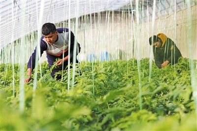 在新疆莎车县戈壁产业园,农户在温室大棚给西红柿打尖(12月12日摄)。