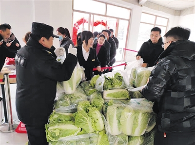 活动开始,前来领取白菜的业主们络绎不绝,井然有序地排着长队。物业员工们分工有序、互相配合,用心对待每位业主,注重每一处细节服务。为方便业主们领取大白菜,特地为每颗白菜都套上了包装袋,干净卫生地将白菜送到业主手里。