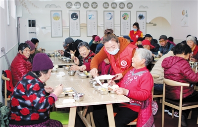 12月15日,在青岛市即墨区通济街道“长者食堂”,志愿者给老人们添饭。