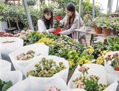12月23日,花农在河北省唐山市丰润区花卉市场包装花卉。