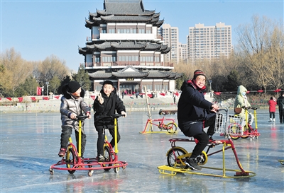 元旦期间,不少市民走出家门来到冰封的湖面上撒欢儿,滑冰车、冰上三轮车、冰上自行车,来一场冰上竞技,你追我赶、欢声笑语,一派热闹祥和的景象。图为家长利用假期带孩子们来到平旺公园体验冰上乐趣。 本报记者 于宏摄