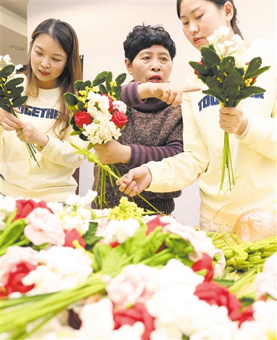1月6日,励美丽(中)在指导员工编结绒线花。