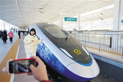 当日,北京冬奥列车亮相京张高铁。据介绍,北京冬奥列车全部使用时速350公里复兴号动车组开行,并配备5G超高清演播室。冬奥列车编组8辆,定员564人,外观采用“瑞雪迎春”涂装方案。冬奥列车将在1月21日至3月16日的冬奥运输期间开行,每日安排开行40对运输方案。 新华社记者 鞠焕宗摄