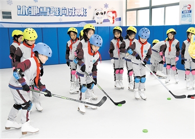 1月11日,青岛市基隆路小学的同学们在体育课上练习冰球。