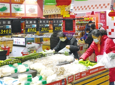 随着春节的临近,不少市民已经开始置办起了年货。记者走访市内多个农贸市场和超市了解到,粮油、蔬菜、肉类等生活必需品货源充足、价格稳定。图为昨日在西环路的一家大型超市内,市民正在选购商品。 本报记者 戎禹仁摄