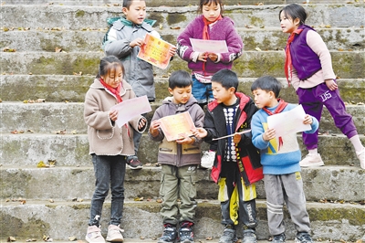 1月13日,获奖的孩子们在散学典礼上向同伴展示奖状。