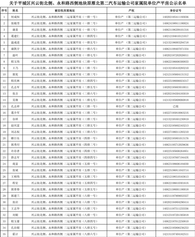 原雁北第二汽车运输公司家属院位于平城区兴云街北侧、永和路西侧地块,因种种原因无法按政策要求提供有效的单位分房花名及证明。现将该35户现住户资料进行登报公示,如有异议可在公示之日起5个工作日内书面向大同市平城区文瀛湖街道办事处提出,若无异议将按照相关政策办理安置手续。