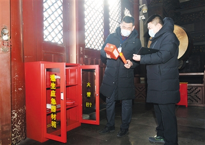 连日来,市辽金文化艺术博物院组织人员对华严寺景区内的各类消防设施进行检查、维护和保养,并对景区职工进行消防安全培训,进一步完善景区的消防安全管理体系和应急预案,筑牢安全“防火墙”。图为1月19日,工作人员检查景区内各类消防设施。