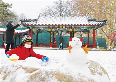近日,我国多地出现降雪天气。图为1月22日,一名小朋友在家人的陪伴下在北京地坛公园堆雪人。 新华社发(胡庆明摄)