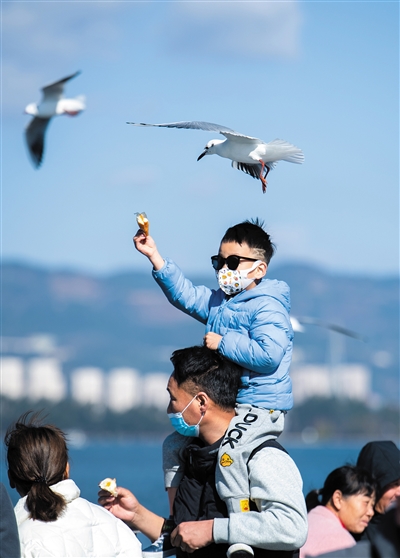 1月23日,小朋友在昆明市滇池海埂大坝投喂红嘴鸥。