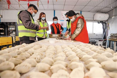 1月23日,河北唐山遵化市东旧寨镇志愿者在京秦高速(遵秦段)一处工程建设者驻地和工人一起包饺子。