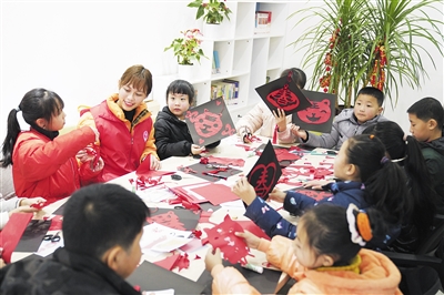 1月25日,在重庆市北碚区未成年人救助保护中心,志愿者指导孩子们制作迎春剪纸工艺品。