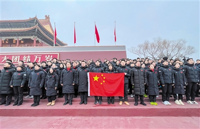 1月25日,中国体育代表团部分成员宣誓出征北京冬奥会。当日,北京冬奥会中国体育代表团部分成员来到天安门广场观看升国旗仪式,并宣誓出征。 新华社发(国家体育总局冬季运动管理中心供图)