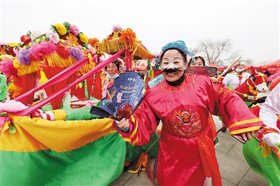 当日是农历腊月二十二,江苏省连云港市赣榆区黑林镇举行“民俗踩街闹新春”巡演活动,民间艺人们身着各色服饰,表演扭秧歌、划旱船、跑驴等多彩民俗节目,喜迎新春佳节。 新华社记者 司伟摄