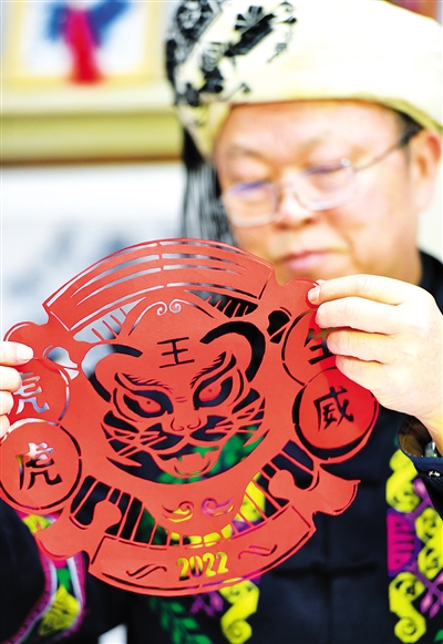 “踏虎凿花”因起源于湖南省湘西土家族苗族自治州泸溪县踏虎村、用刻刀在蜡板上以彩纸凿出不同图案而得名,被称为“不用剪刀的剪纸艺术”,最初用于苗族服饰上的纹样蓝本,而后逐渐演变为当地独具特色的少数民族民间传统手工艺品,创作主题不断丰富,刀法技艺日趋复杂。2008年,“踏虎凿花”被列入国家级非物质文化遗产扩展项目名录。 新华社记者 赵众志 摄