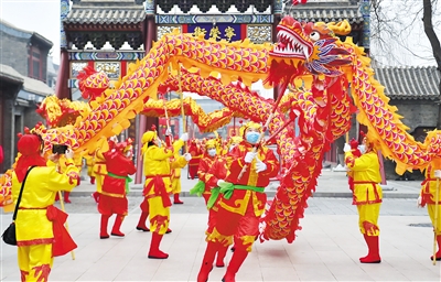 春节临近,河北省石家庄市正定县组织开展多彩非遗迎新春文化演出活动,当地民间艺人带来舞龙、战鼓、跑竹马、踩高跷等非遗表演,喜迎即将到来的虎年春节。图为1月27日,在河北省正定古城荣国府景区宁荣街,民间艺人进行舞龙表演。 新华社发(张晓峰摄)