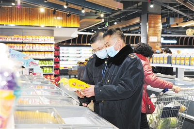春节临近,年货市场迎来了消费高峰。为维护我市市场经济秩序,营造安全放心的消费环境,1月27日上午,市市场监督管理局执法人员针对节日期间的消费特点,深入商场超市、餐饮店等,加大安全监管检查力度,为广大市民放心采购年货保驾护航。图为执法人员在超市对食品标签标识等进行检查。 本报记者 于宏摄