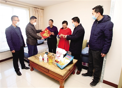 1月28日,市文明办对我市历届道德模范群体中的困难家庭及家属进行了慰问,同时,市创城指挥部办公室、中国建设银行股份有限公司大同云汽支行、市公共法律服务中心还对平城区水泊寺街道辖区的20余名老党员、困难党员家庭进行了走访慰问,为他们送去慰问物资及新春祝福。图为工作人员在水泊寺街道慰问老党员。