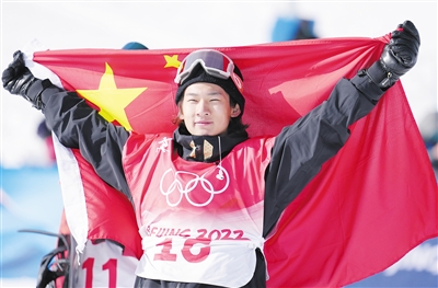 “在比赛没结束那一刻,你永远不知道什么会发生,所以在那个时候我要做自己最好的一面,把自己最好的一套动作完成出来,这个是我今天最大的目标,不管是在第几趟。”身披国旗,手握特别版的“冰墩墩”,苏翊鸣的脸上写满幸福:“首先我要特别感谢我的祖国一直在背后支持着我,如果没有我的祖国,我拿不了今天的成绩。其次就是我的家人,我的每个朋友对我的支持,如果没有我的父母第一次带我尝试滑雪,可能今天我不会站在冬奥会的舞台上,站在领奖台上。我特别要感谢所有支持我关心我为我加油的人,这个成绩是我们大家一起完成的!”