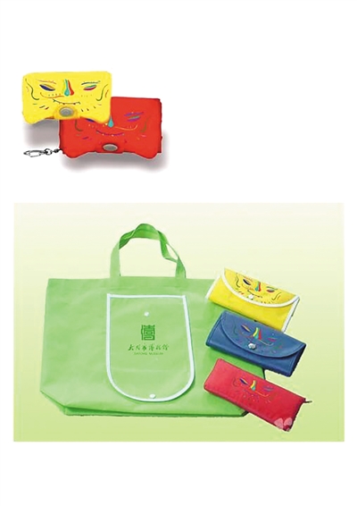 2.人面纹半瓦当:人面纹半瓦当直径20.9厘米、宽约15厘米,2003年大同操场城北魏1号建筑遗址采集。利用瓦当图案,设计成折叠购物袋。