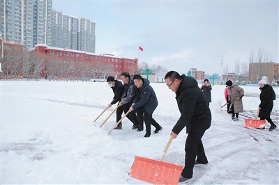 天气虽然寒冷,但党员们干劲十足。经过大家的共同努力,校园周围路面上的积雪做到了及时清除,道路环境得到改善,保障了行人、车辆的出行安全。校园内小广场、道路、操场跑道的积雪全部清除,保障开学后教育教学活动不受影响。