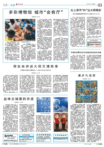 在北京大兴国际机场,航站楼将博物馆元素布满远机位的候机区,使旅客进入候机区就能感受到博物馆的氛围。刘勇说,很多博物馆都在机场设立了文创展示空间,有的博物馆还走进了地铁站、商场。苏州博物馆在上海新世纪商场推出了一个展览,24天的展览,观众量达10万,把展览、社会教育和文创结合在一起,特别适合年轻人体验。这些都值得大同借鉴。
