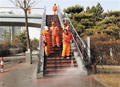 从15日起,该中心首先集中两周的时间,出动洗路车、洒水车、雾炮车等环卫设施,对辖区范围内所有主次干道、非机动车道、人行便道、13座过街天桥、开源桥等7座大桥,总面积约1400万平方米的公共区域进行全面冲洗和深度清洗,彻底清理积尘,确保路面见本色,道路整体干净整洁。